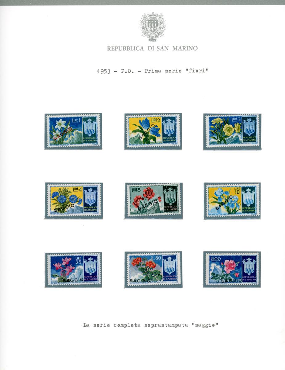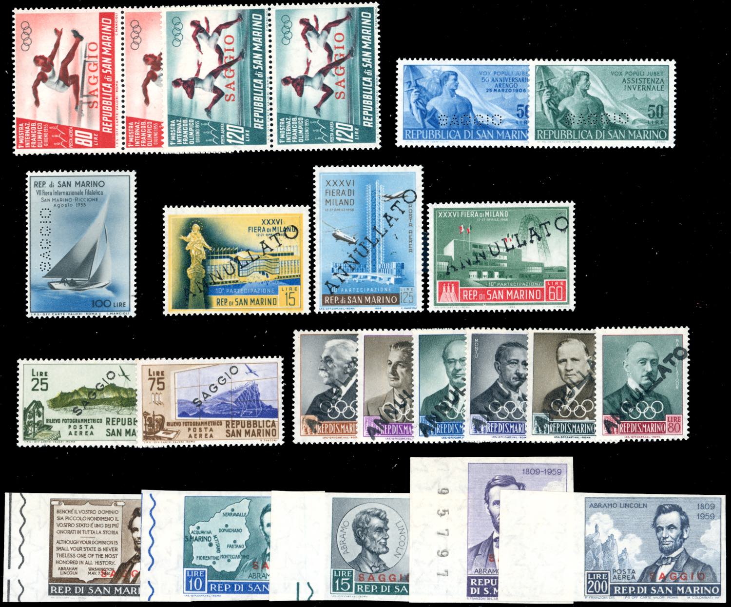 SAN MARINO 1947/1960 - Bell'insieme di francobolli e serie complete del periodo di posta ordinaria ed aerea, soprastampati o perforati "saggio"/"annullato", in alcuni casi non dentellati, gomma originale integra, perfetti. Raro insieme.