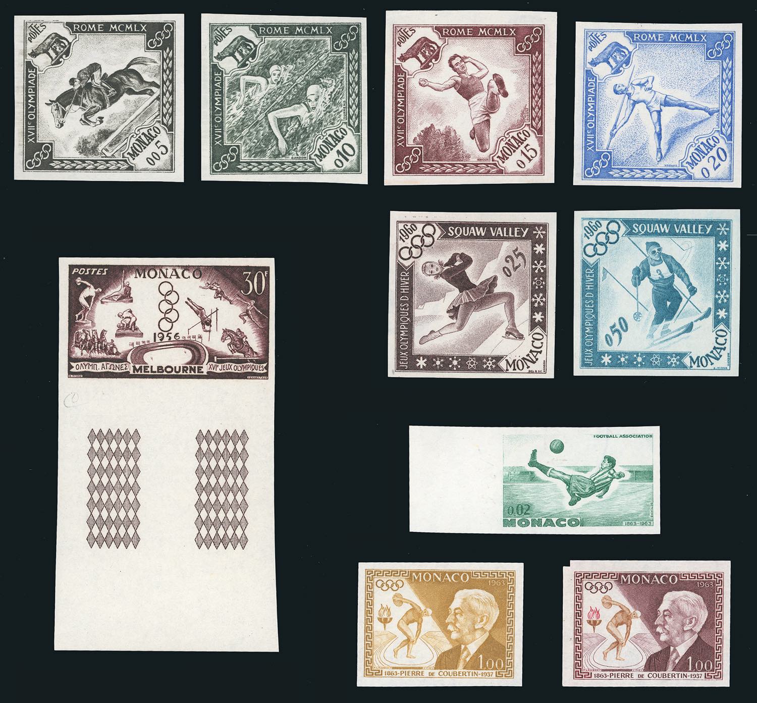 MONACO 1956/1963 - Bell'insieme di 10 prove non dentellate di emissione a tema sportivo, tra cui le Olimpiadi di Roma 1960, gomma integra, perfette.