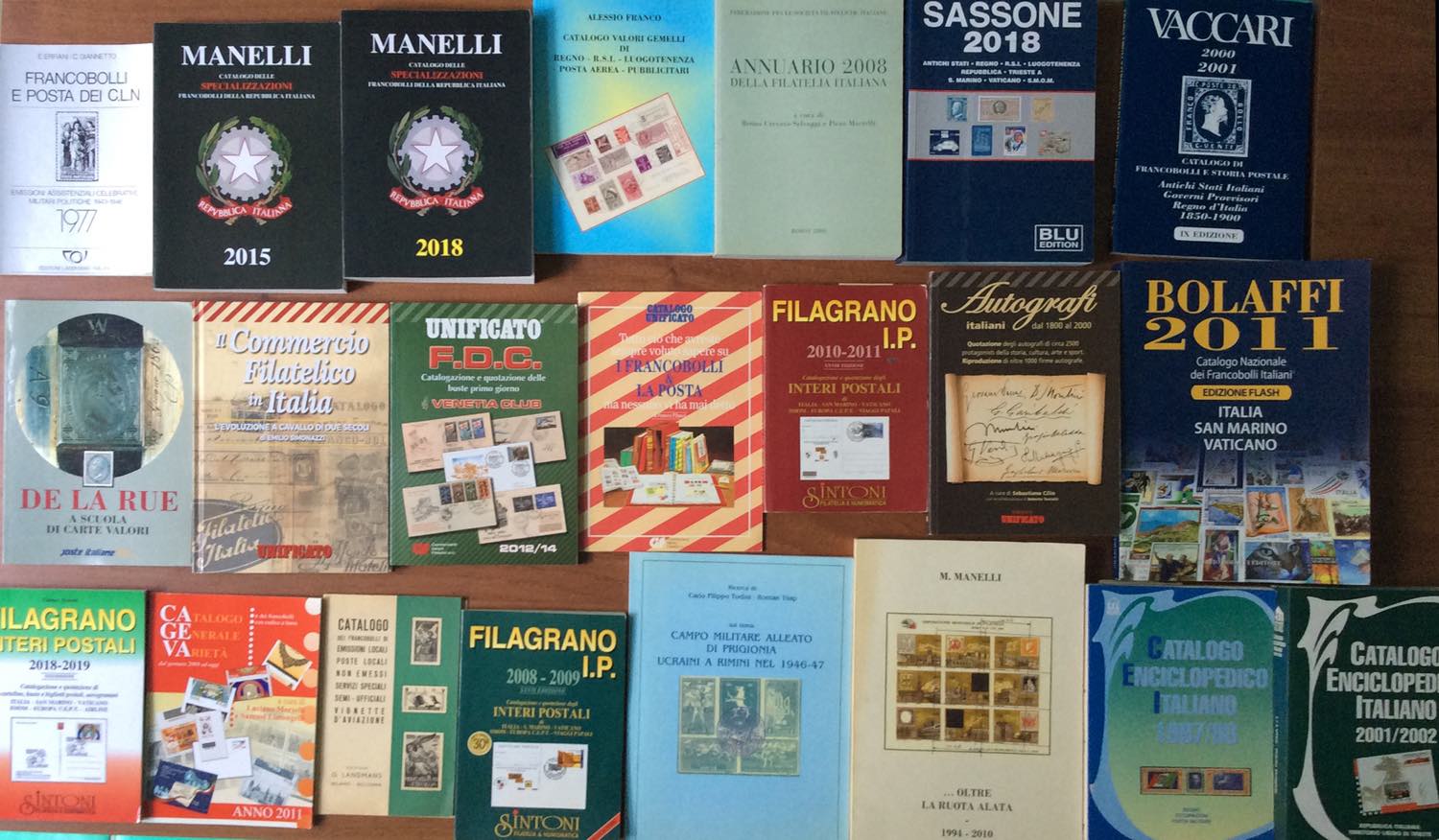 AREA ITALIANA - Scatola contenente numerosi cataloghi e pubblicazioni di filatelia e storia postale sull'argomento.