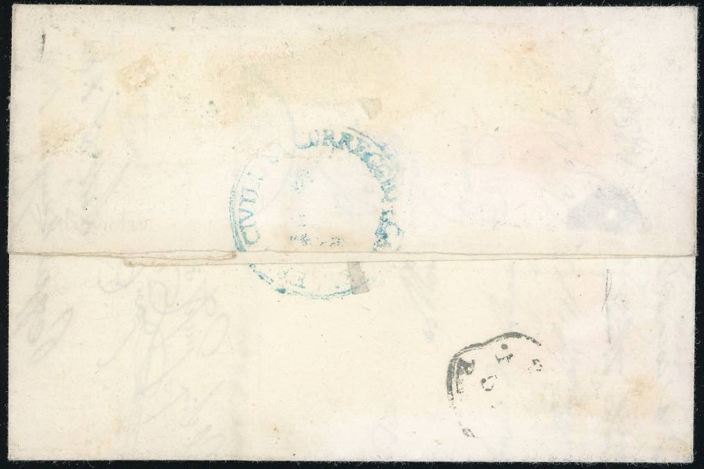 1856 - 40 cent. celeste (5), perfetto, su lettera raccomandata da Correggio 23/1/1856 a Montecchio. Rarissimo uso di questo francobollo su ... Read more