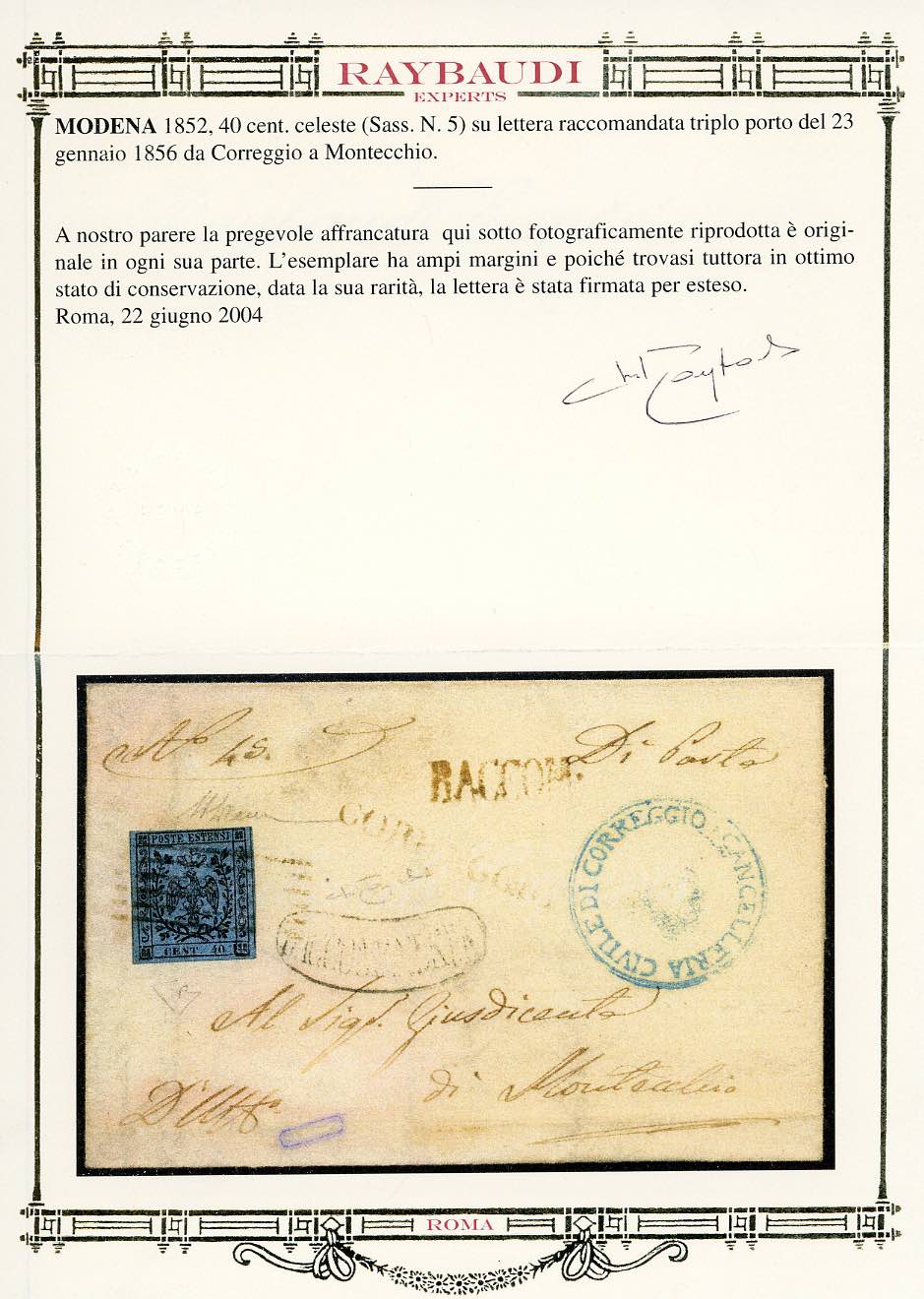 1856 - 40 cent. celeste (5), perfetto, su lettera raccomandata da Correggio 23/1/1856 a Montecchio. Rarissimo uso di questo francobollo su lettera raccomandata per l'interno. A.Diena, cert. E.Diena e Oro Raybaudi.