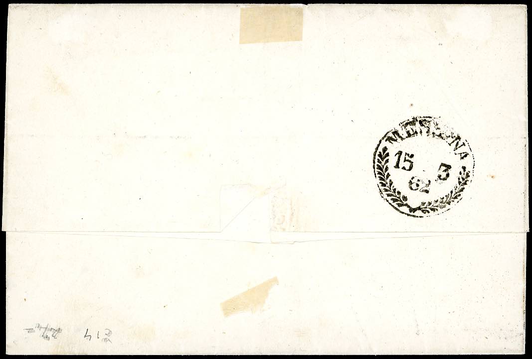 1862 - 5 grana rosso carminio (21), bel pli d'accordeon orizzontale, perfetto e ben marginato, su fresca sopracoperta di lettera da Napoli 14/3/1862 a Messina. Rara varietà su questa emissione, di splendida qualità. Chiavarello, cert. Bottacchi. Ex coll. Imperato.