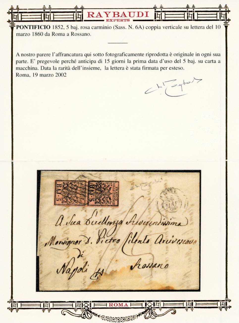 1860 - 5 baj rosa carminio (6A), coppia, perfetta, su lettera da Roma 10/3/1860 a Rossano, tassata. Cert. Raybaudi.
