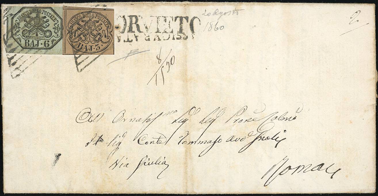 1860 - 6 baj grigio verdastro, 3 baj bruno (7,4Aa), il primo sfiorato in alto, su lettera assicurata da Orvieto 18/8/1860 a Roma. R.Diena.