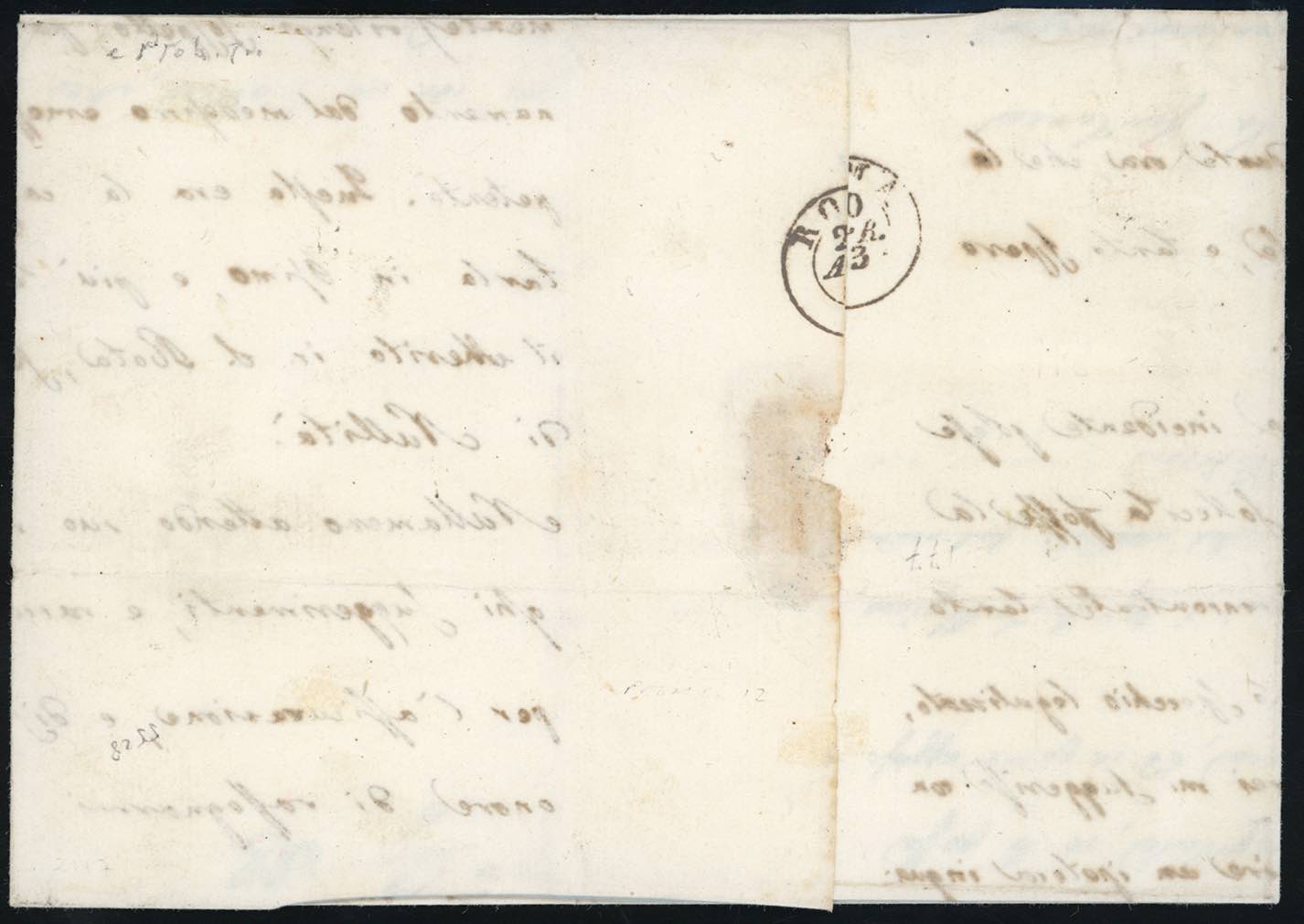 1852 - 6 baj grigio azzurrastro, striscia orizzontale di tre, bordo di foglio, 2 baj verde oliva (7b,3), perfetti, su busta di 4 porti da Montegiorgio 18/4/1853 a Roma. I francobolli sono stati coannullati anche con il bollo a griglia bipartita di Fermo, combinazione non catalogata. Bella e rara. E.Diena, cert. Bottacchi.