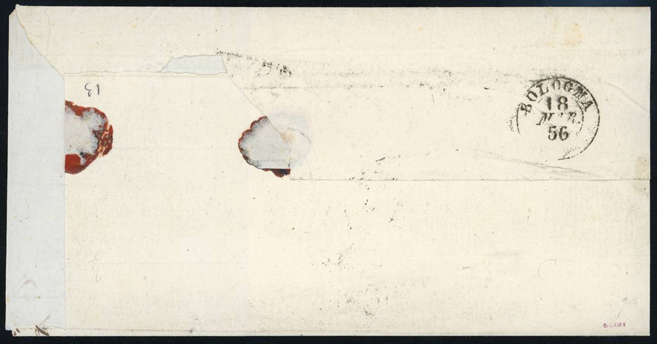 1856 - 6 baj grigio verdastro, stampa con inchiostro grigio oleoso (7c), striscia verticale di 4, l'ultimo esemplare intaccato a sinistra, su fresca sovracoperta di lettera da Roma 15/3/1856 a Bologna. Rara e di ottimo aspetto. A.Diena, cert. Bottacchi.