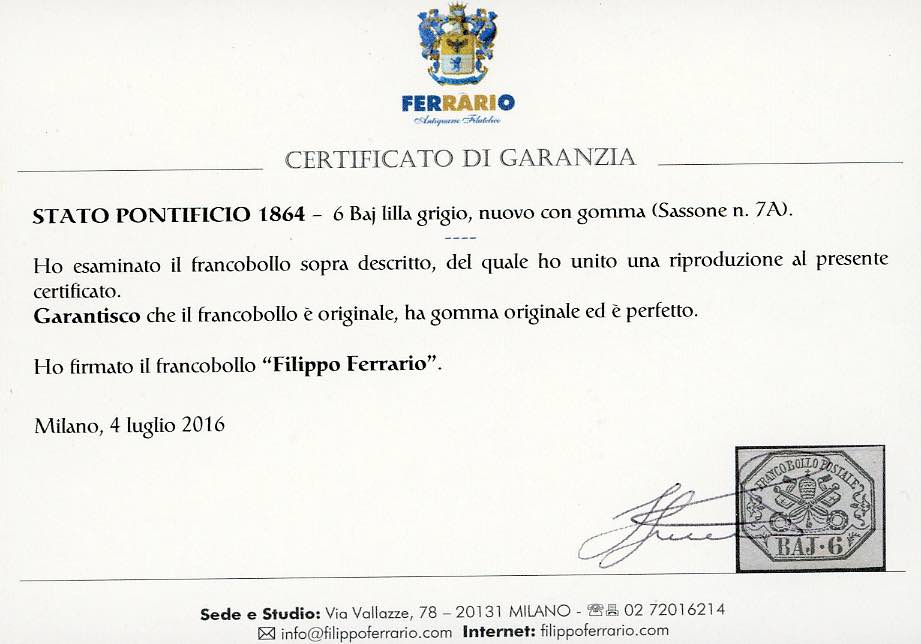 1864 - 6 baj lilla grigio (7A), nuovo, gomma originale, perfetto. Bello! A.Diena, cert. Ferrario.