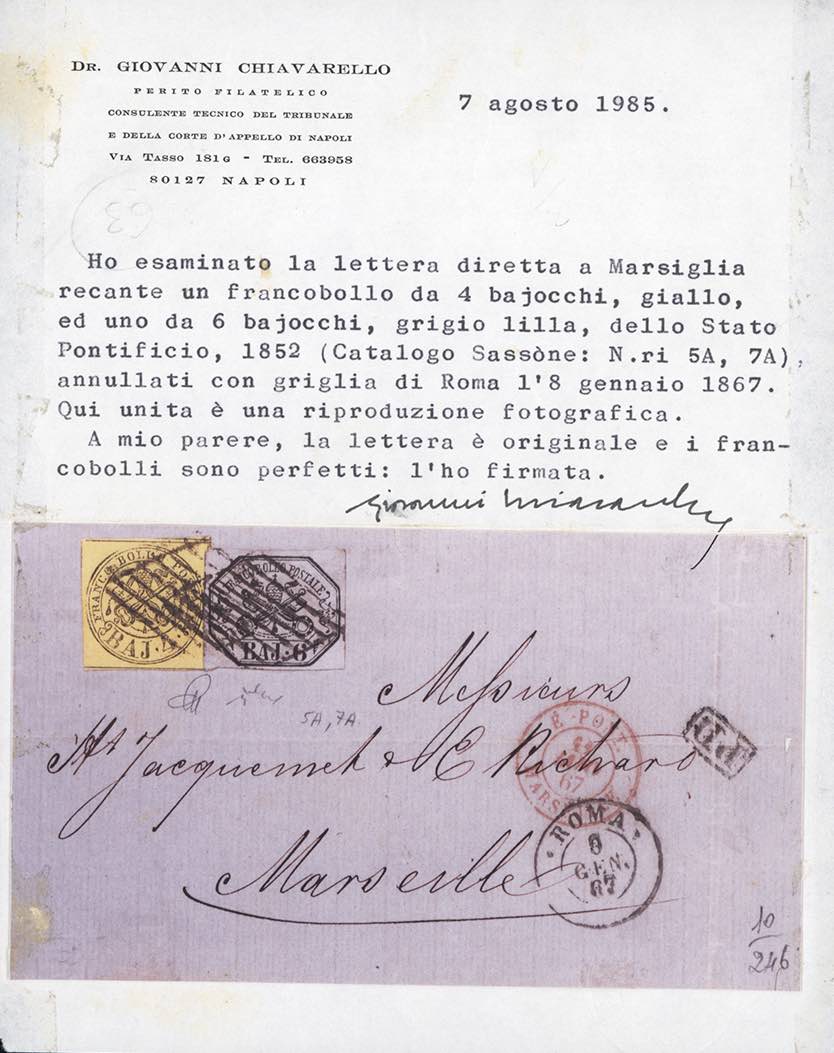 1867 - 6 baj lilla grigio, 4 baj giallo (7A,5A), perfetti, su sovracoperta di lettera da Roma 9/1/1867 a Marsiglia. Cert. Chiavarello.
