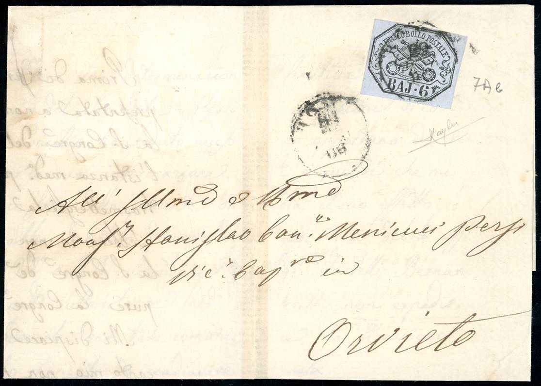 1866 - 6 baj azzurrastro (7Ab), perfetto, su lettera (elegantemente restaurata al centro, lontano dal francobollo), di triplo porto da Roma 21/5/1866 ad Orvieto. Molto fresca. Raybaudi.