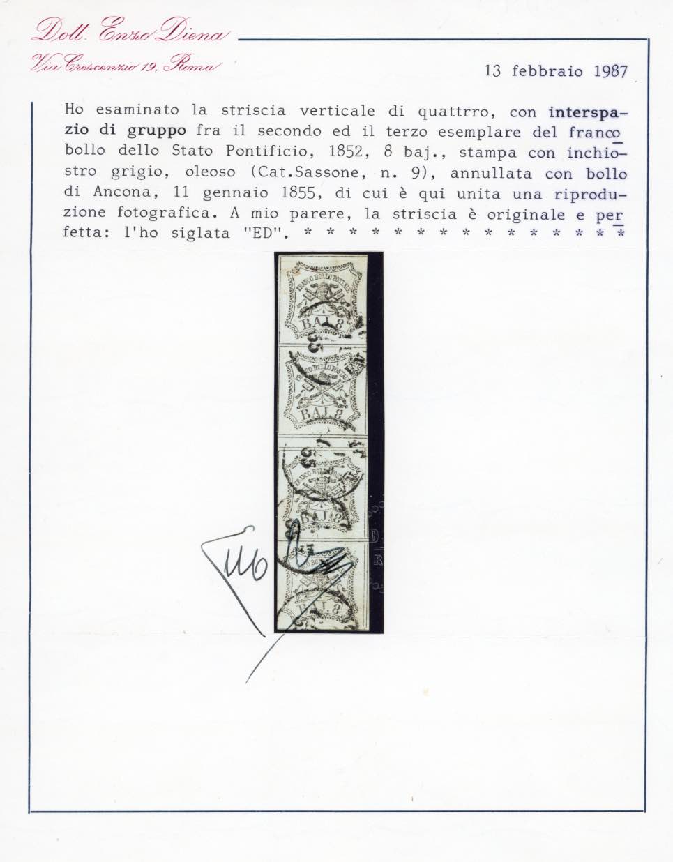 1854 - 8 baj bianco, stampa con inchiostro grigio oleoso (9a), striscia verticale di quattro, interspazio di gruppo al centro, perfetta, usata ad Ancona 1/1/1855. Bella! A.Diena, cert. Diena (cat. Sassone ca. € 5.000 in proporzione).