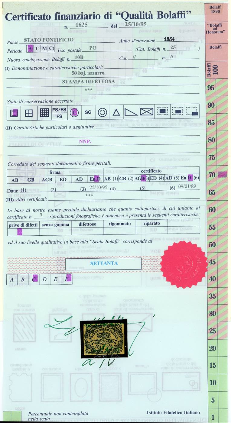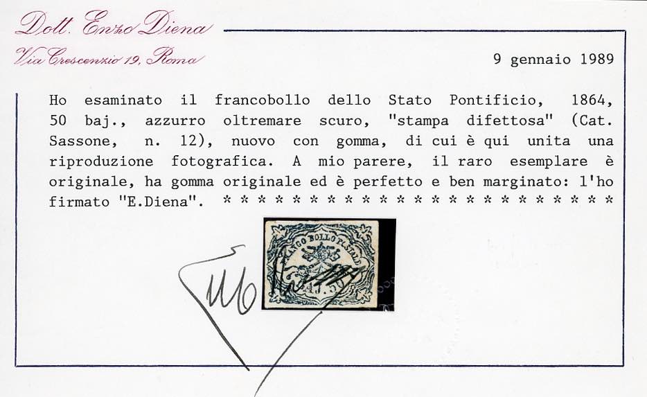 1864 - 50 baj azzurro oltremare scuro, stampa difettosa (12), nuovo, gomma originale, perfetto, Molto fresco, margini enormi. Sicuramente uno dei migliori esemplari esistenti allo stato di nuovo. Rarità. Emilio ed Alberto Diena per esteso, cert. Colla.