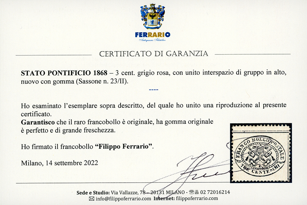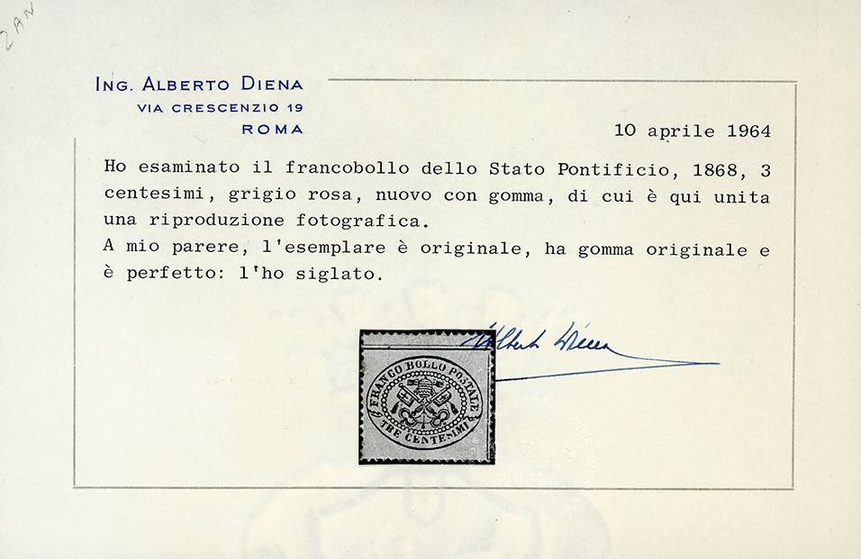 1868 - 3 cent. grigio rosa, esemplare con unito l'interspazio di gruppo (23/II), gomma originale, perfetto. Bello e raro! Cert. A.Diena e Ferrario.