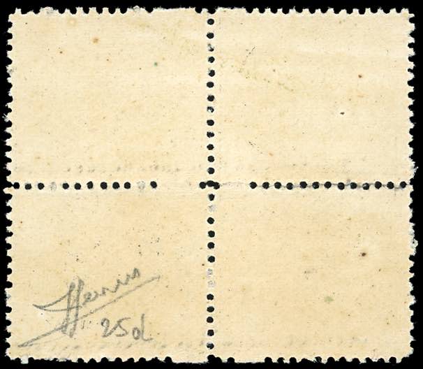 1868 - 5 cent. azzurro scuro, blocco di quattro, due esemplari senza punto dopo "5" (25d,25d/h), gomma originale integra, perfetto. Raro e di ottima qualità. Cert. Sorani (cat.Sassone oltre 40.000 € in proporzione).