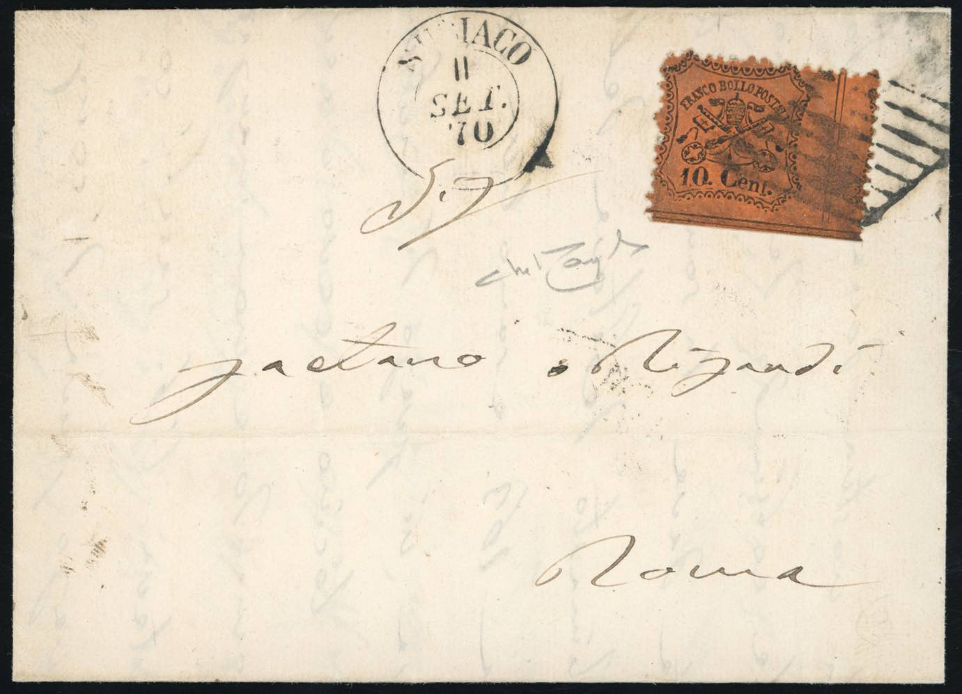 1870 - 10 cent. arancio vermiglio (26c), dentellatura verticale a destra fortemente spostata, formato orizzontale più grande, su lettera da Subiaco 11/9/1870 a Roma. Bella varietà. Raybaudi.