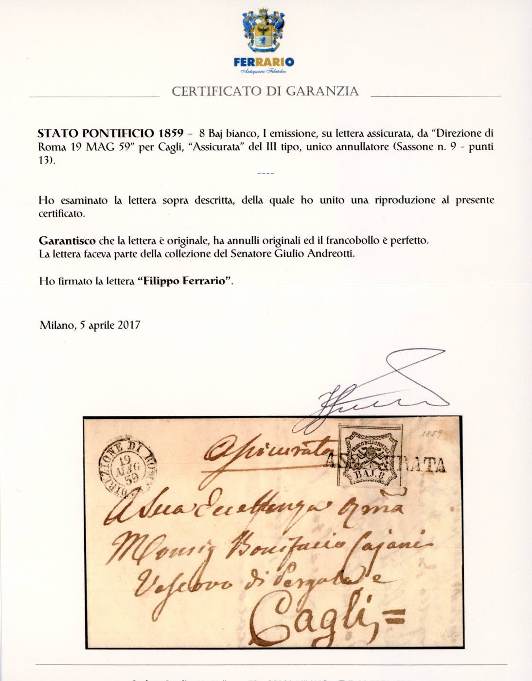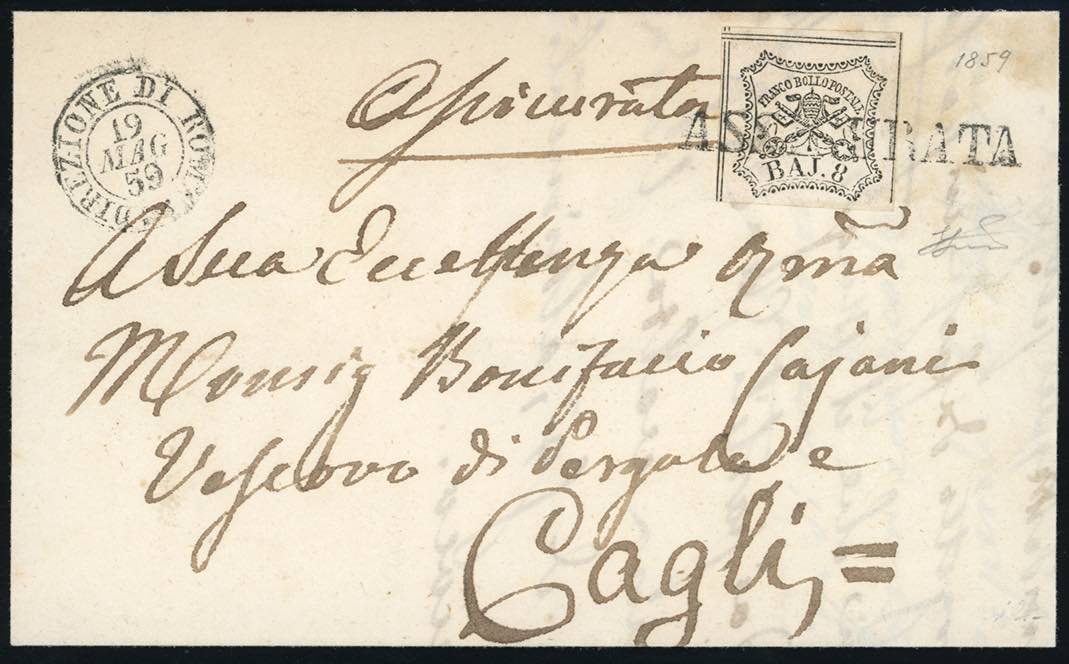 ROMA, Dir + ASSIC unico annullatore punti 13 - 8 baj (9), perfetto, su lettera assicurata del 19/5/1859 per Cagli. Rara e molto bella. Cert. Ferrario. Ex coll. Andreotti.