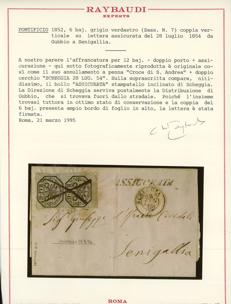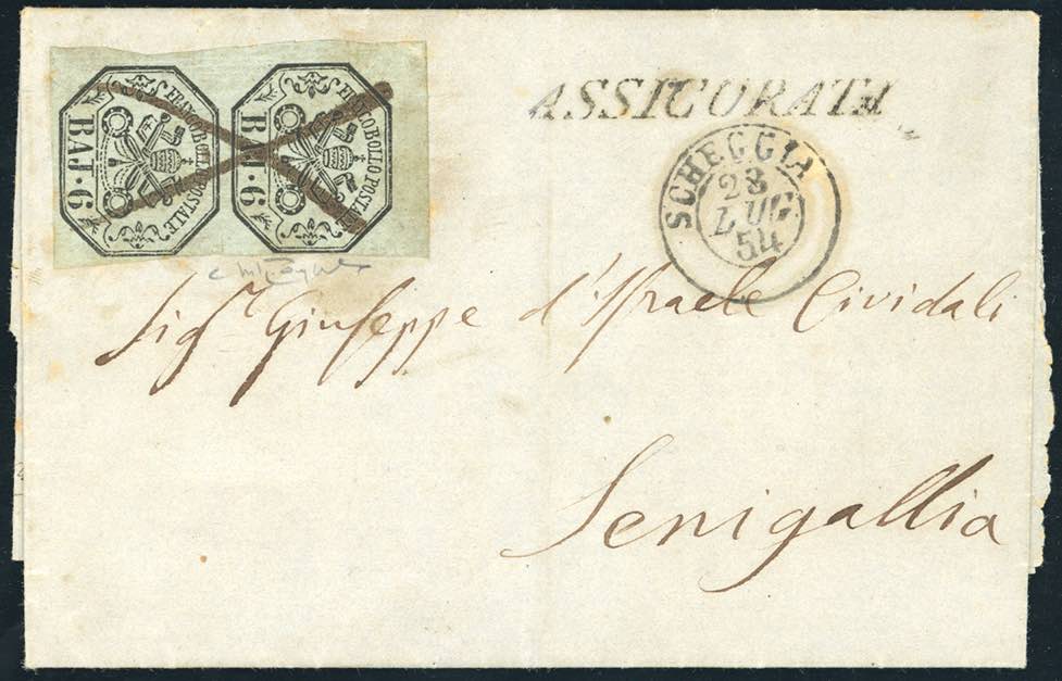 SCHEGGIA, penna non catalogato - 6 baj (7), coppia verticale, ottimo stato, su lettera assicurata da Gubbio 28/7/1854 a Senigallia. Raro annullamento, inedito per questo ufficio. Cert. Raybaudi.