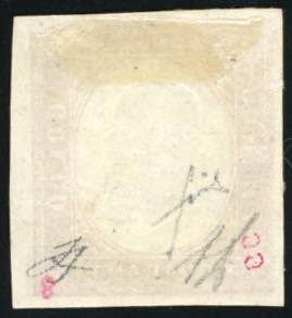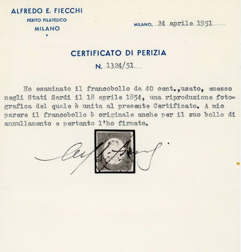 1854 - 40 cent. rosso mattone (9), perfetto e ben marginato, usato. Molto bello. A.Diena, cert. Fiecchi e Ferrario.