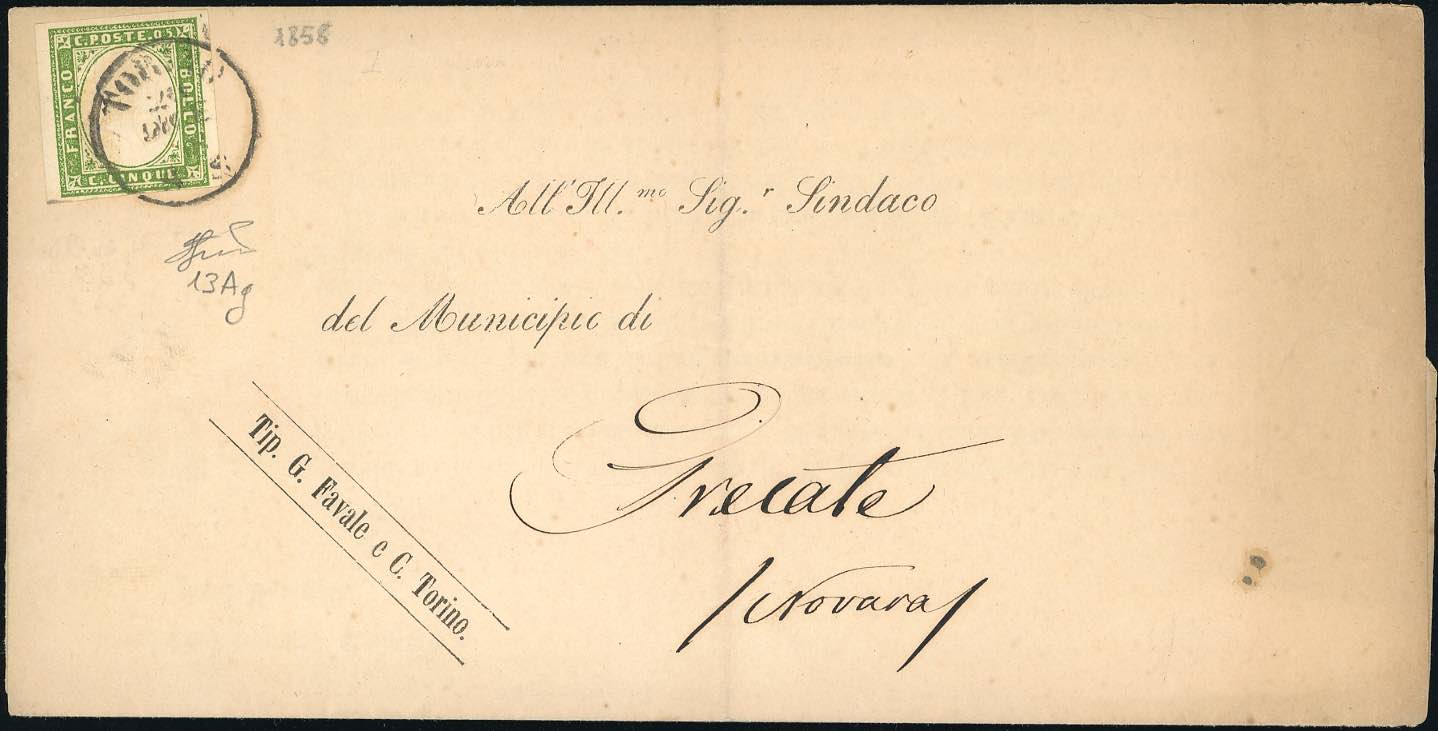 1858 - 5 cent. verde giallo olivastro (13Ag), perfetto, isolato su circolare da Torino 20/12/1858 a Trecate. Cert. Ferrario.