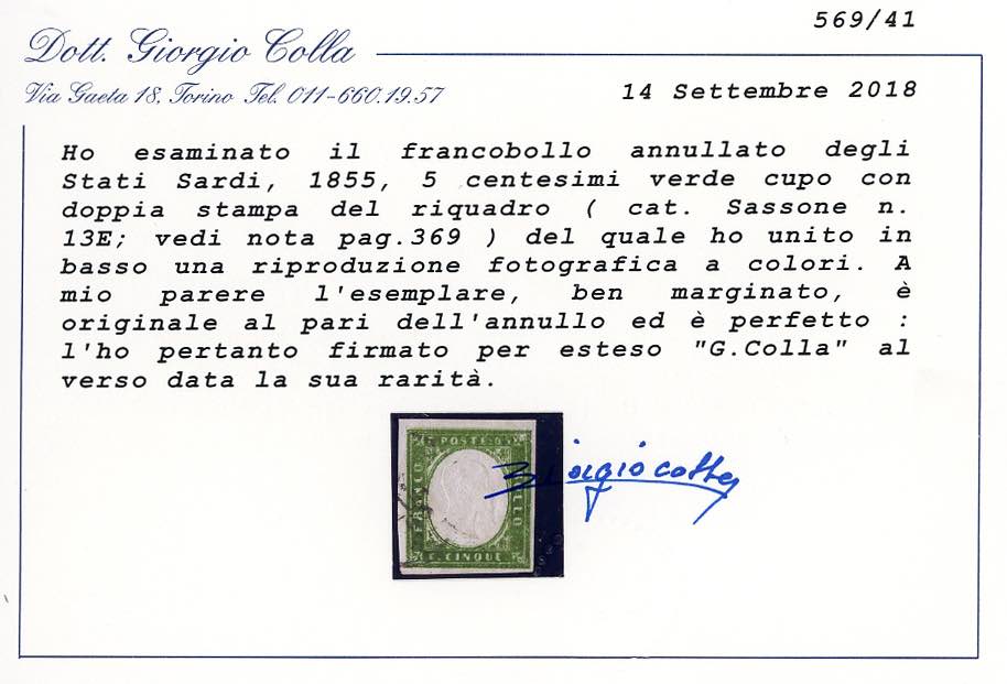 1863 - 5 cent. verde cupo, doppia stampa del riquadro (13E, nota pag. 371), perfetto, usato. Molto raro! Cert. Colla.