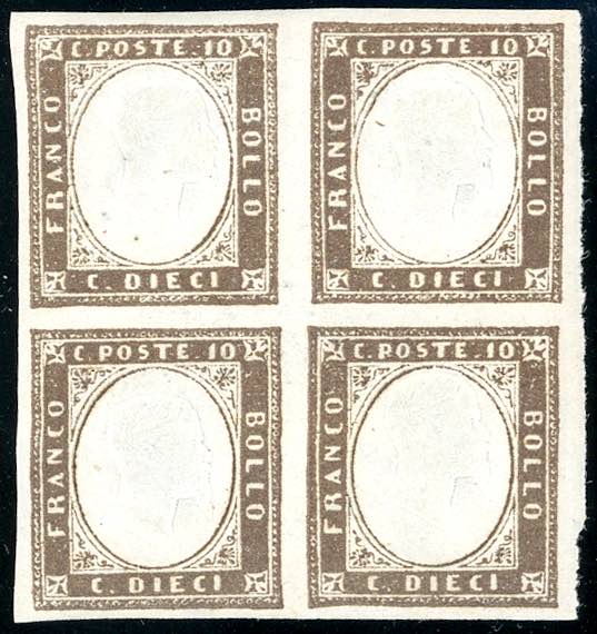 Lot 614 - 1859 - 10 cent. bruno grigiastro (14A), blocco di quattro, ...