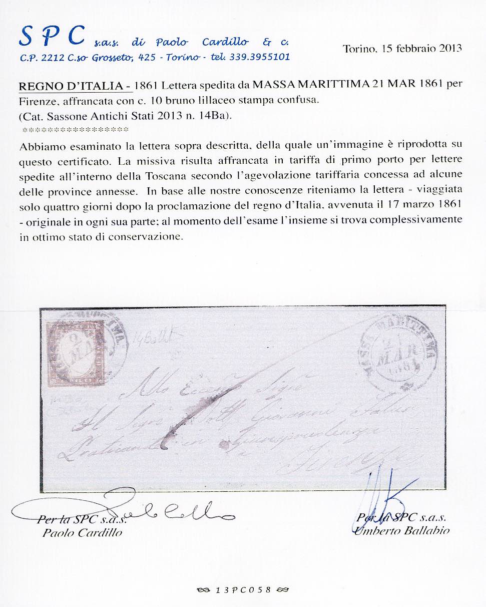 1861 - 10 cent. bruno lillaceo (14Ba), perfetto, su sovracoperta di lettera da Massa Marittima 21/3/1861 a Firenze. Cert. Cardillo. Ex ... Read more