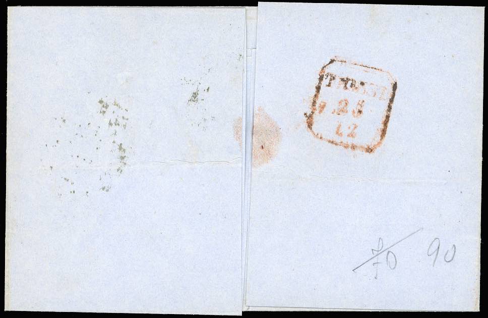 1860 - 10 cent. bruno olivastro scuro (14Bd), coppia verticale, perfetta e ben marginata, su sovracoperta di lettera da Ancona 23/12/1860 a ... Read more