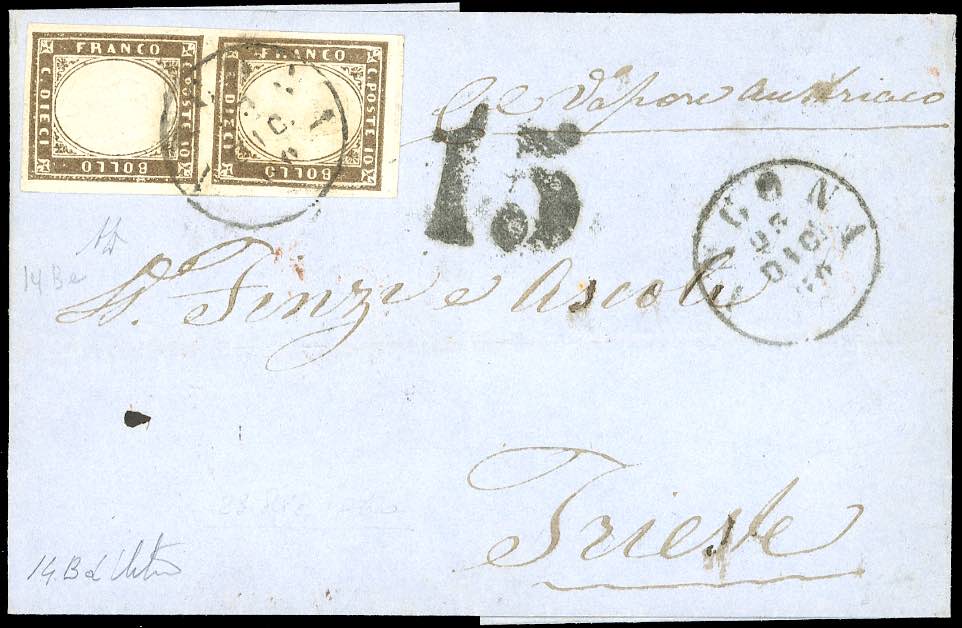 1860 - 10 cent. bruno olivastro scuro (14Bd), coppia verticale, perfetta e ben marginata, su sovracoperta di lettera da Ancona 23/12/1860 a Trieste, tassata 15 soldi, manoscritto "col vapore austriaco". Interessante. A.Diena. Ex coll. Hess.