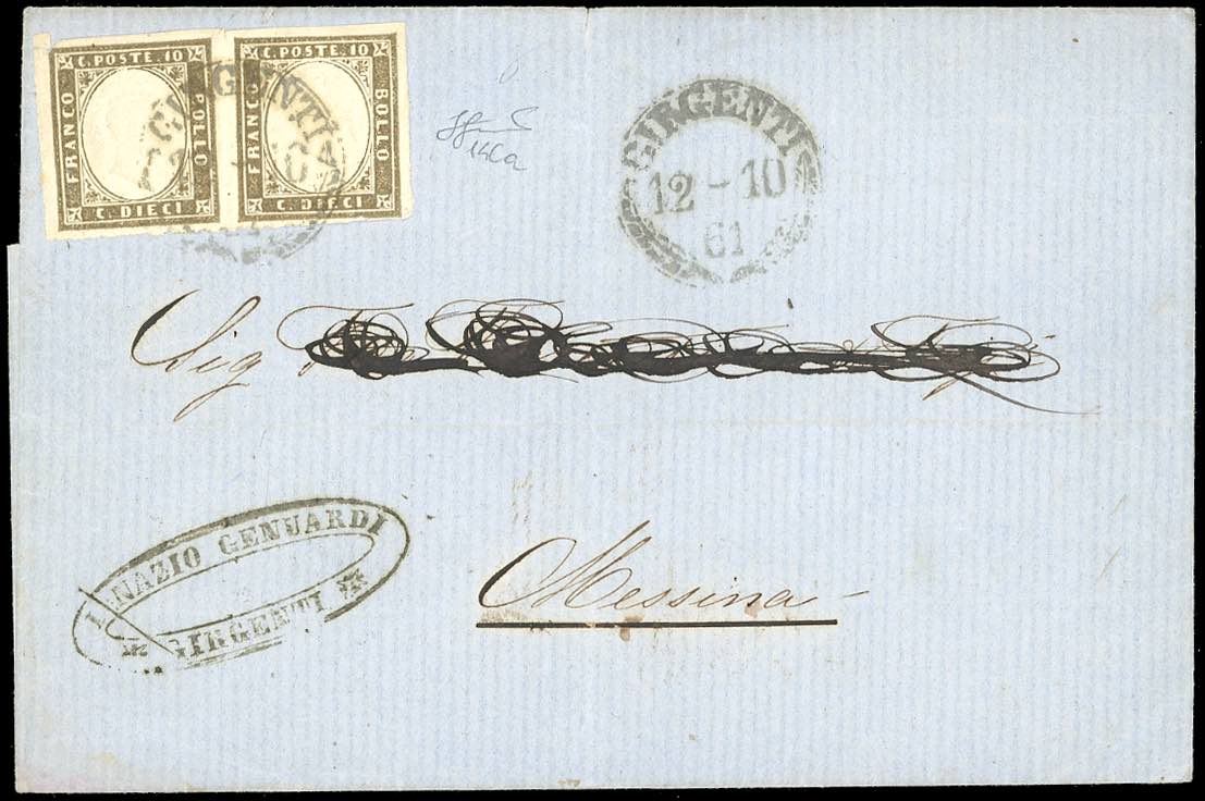 1861 - 10 cent. grigio olivastro scuro (14Ca), coppia, ottimo stato, su sovracoperta di lettera da Girgenti 12/10/1861 per Messina. ... Read more