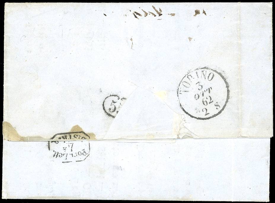 1862 - 10 cent. bruno rossastro (14Cn), tre ottimi margini, giusto a destra, isolato su circolare a stampa da Torino 3/10/1862 per città. ... Read more