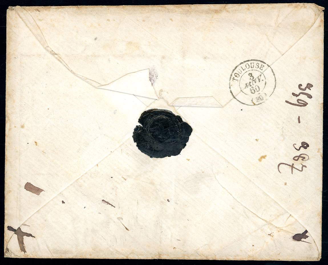 1859 - 20 cent. cobalto oltremare (15Ba), striscia di cinque, due esemplari difettosi, su busta di tre porti da Torino 31/12/1859 a Tolosa, ... Read more