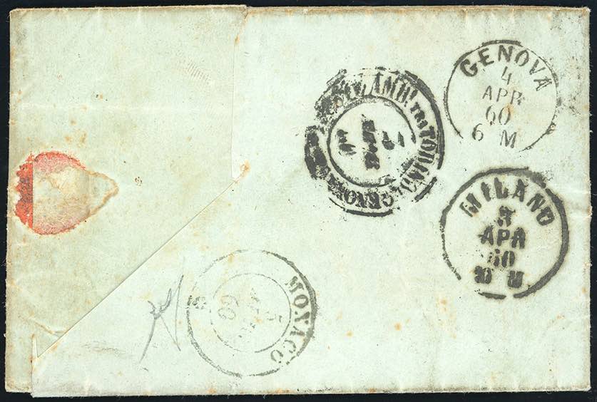 1860 - 20 cent. azzurro scurissimo (15C), difettoso, su lettera da Crema 2/4/1860 al Principato di Monaco, bollo di arrivo al verso. ... Read more
