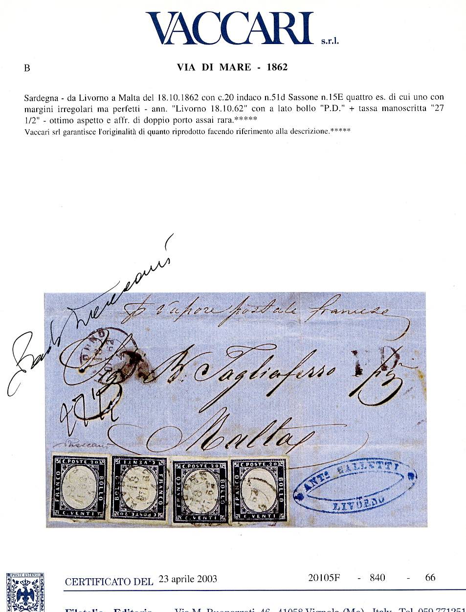 1862 - 20 cent. indaco (15E), quattro esemplari, perfetti, su sovracoperta di lettera di doppio porto da Livorno 18/10/1862 a Malta, ... Read more