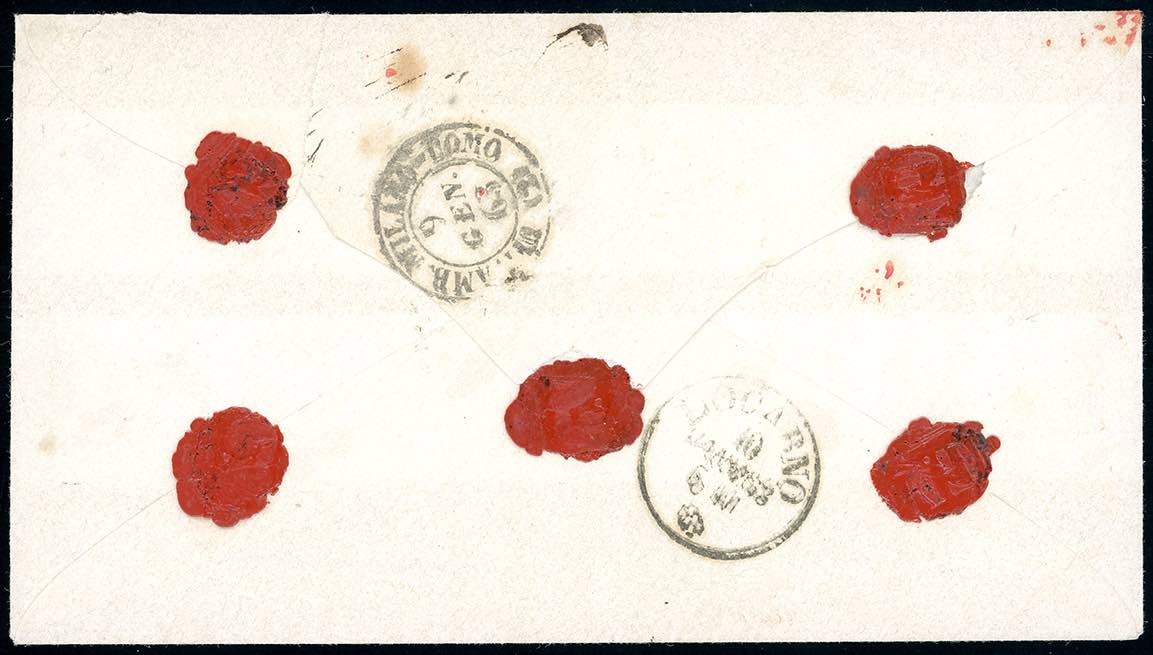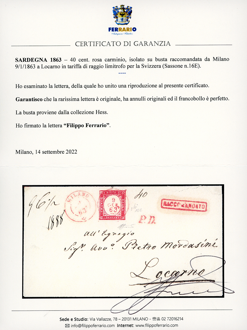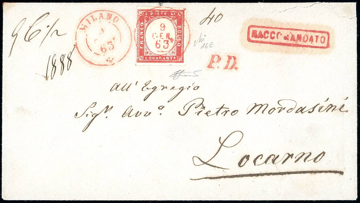 1863 - 40 cent. rosa carminio (16E), perfetto, isolato su busta raccomandata da Milano 9/1/1863 a Locarno. Rarissima lettera raccomandata in tariffa di raggio limitrofo per La Svizzera, di eccezionale qualità. Avi, cert. Ferrario. Ex coll. Hess.