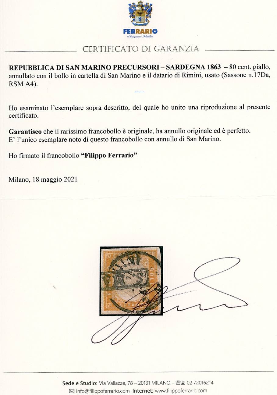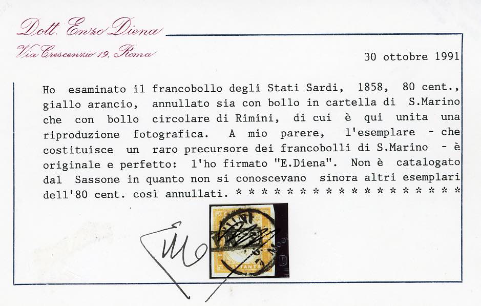 1863 - 80 cent. giallo (Sardegna 17Da,RSM A4), perfetto, annullato con il bollo in cartella di S.Marino e il datario di Rimini. Si tratta dell'UNICO ESEMPLARE NOTO di questo francobollo con annullo di San Marino. Grande rarità del settore. Cert. E.Diena, Oro Raybaudi, Ferrario.