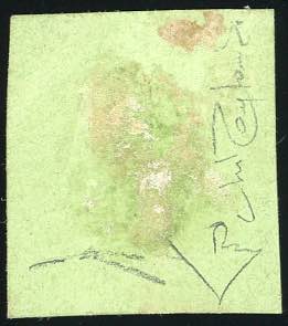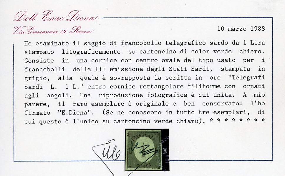 1858 - 1 lira saggio di francobollo per Telegrafi su cartoncino verde chiaro, cornice con centro ovale in grigio e stampa delle diciture in rame, nuovo senza gomma come sempre perfetto. Rarissimo, dei pochissimi esemplari noti è l'unico noto su cartoncino di questo colore. Raybaudi. Cert. E.Diena.
