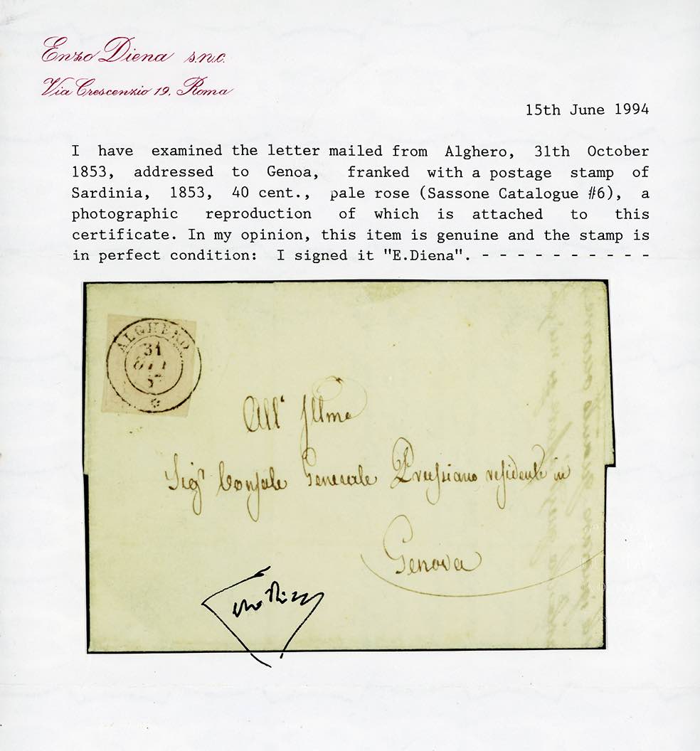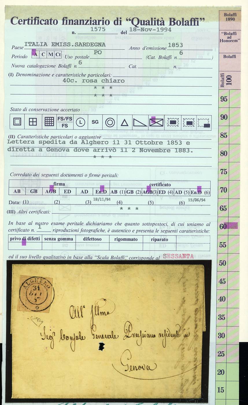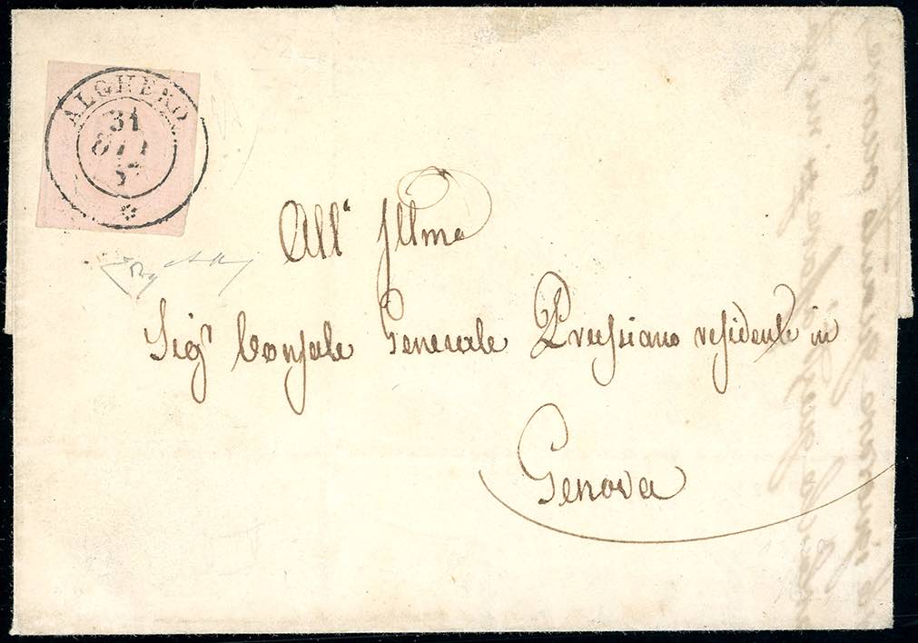 ISOLA DI SARDEGNA-ALGHERO d.c. rosetta, punti 8 - 40 cent. rosa chiaro (6), perfetto, isolato su fresca lettera di doppio porto del 31/10/1853 diretta a Genova. Bellissima! Cert. E.Diena e Bolaffi.
