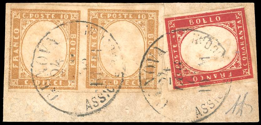 LIGURIA-GENOVA ASSIC.I E RACCOM.I punti 12 - 10 cent., coppia, 40 cent. (14E,16D), buono stato, usati su piccolo frammento 24/7/1863. Non comune e sottoquotato. A.Diena.