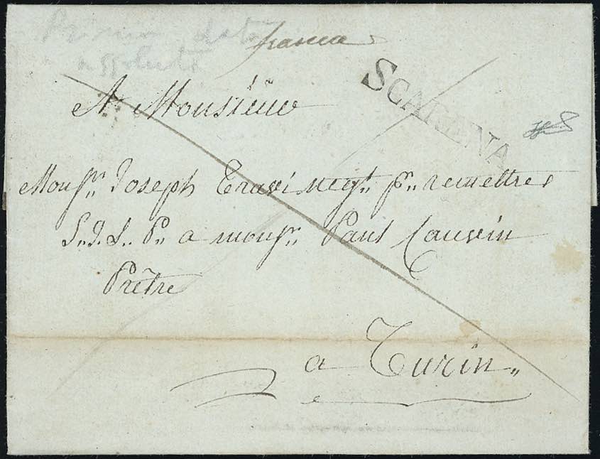 NIZZA-SCARENA, stampatello lineare - 1817 sovracoperta di lettera prefilatelica, con manoscritto "franca" e sbarre incrociate sul fronte e bollo 9 in un cerchio al verso, diretta a Torino. Molto bella e rara in quanto anticipa di 2 anni la prima data nota al Vollmeier. Ferrario.