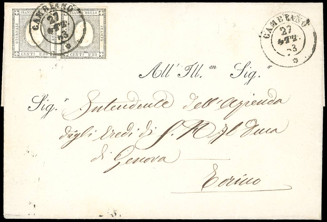 PIEMONTE-CAMBIANO, punti 8 - 1 cent. per stampati (19), coppia, perfetta, su sovracoperta di circolare del 27/10/1863 per Torino. Annullo ... Read more