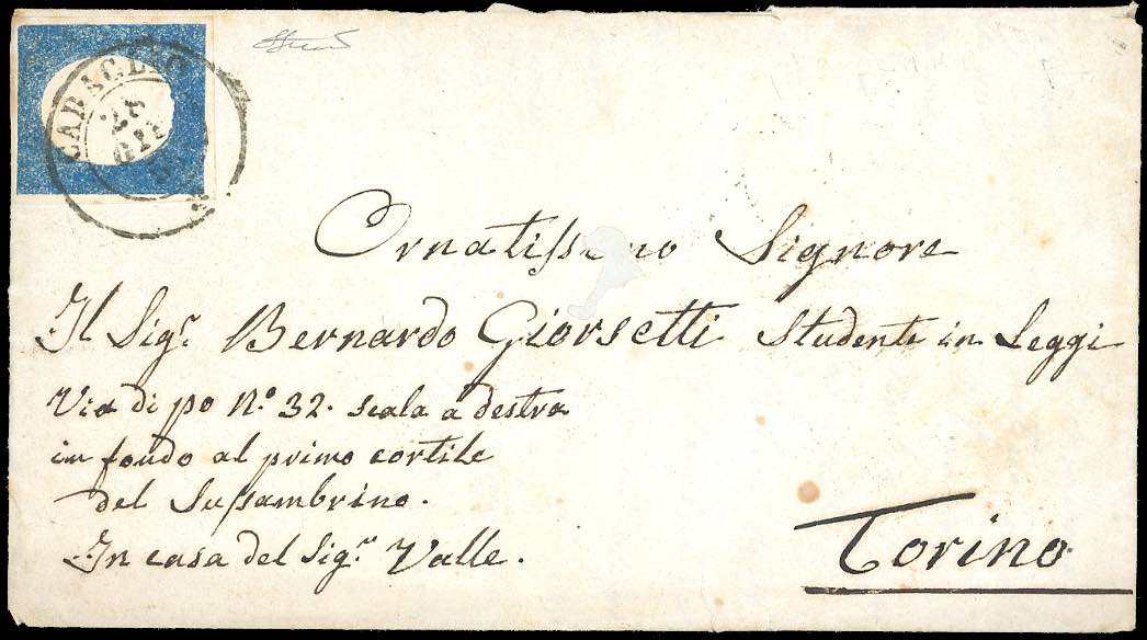PIEMONTE-CARAGLIO, punti 9 - 20 cent. (8b), perfetto, su busta con testo interno del 28/6/1855 per Torino. Non comune. Ferrario.