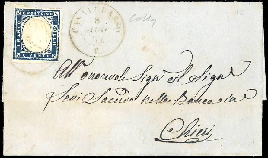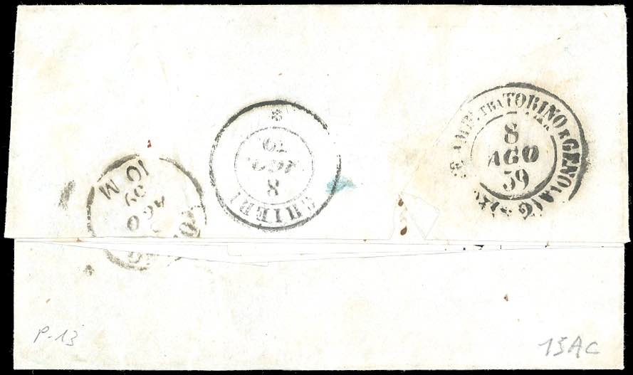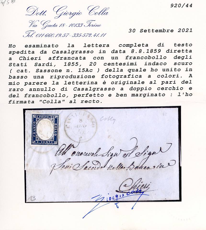 PIEMONTE-CASALGRASSO, punti 13 - 20 cent. (15Ac), perfetto, su lettera del 8/8/1859 per Chieri. Rara. Cert. Colla.