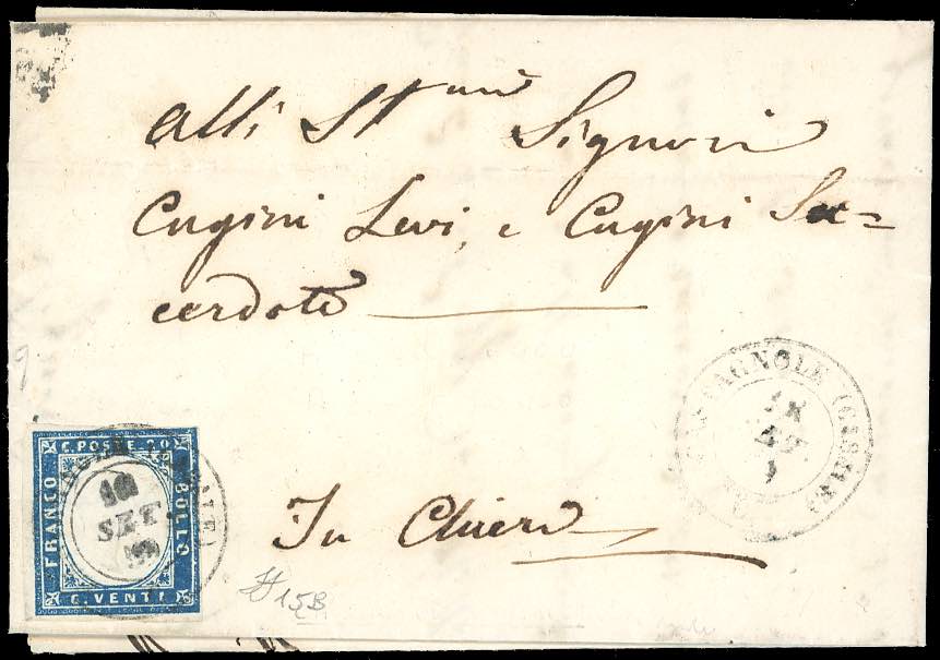 PIEMONTE-CASTAGNOLE (CASALE), punti 9 - 20 cent. (15B), lieve piega orizzontale, su lettera del 18/9/1859 per Chieri. Raro annullo. ... Read more