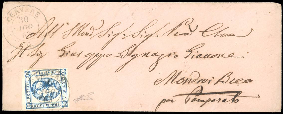 PIEMONTE-CERVERE, punti 8 - 15 cent. (13), perfetto, su busta del 30/8/1863 per Pamparato. Non comune e di ottima qualità. Ferrario.