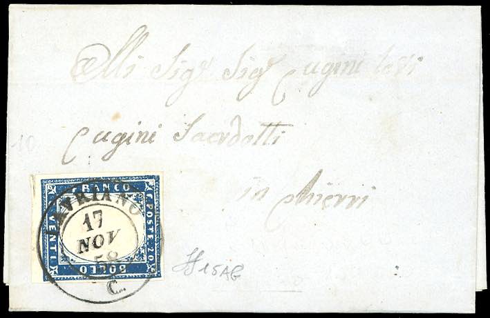 PIEMONTE-LAVRIANO, punti 10 - 20 cent. (15Ab), perfetto, su piccola lettera del 17/11/1858 per Chieri. Bella. Ferrario.