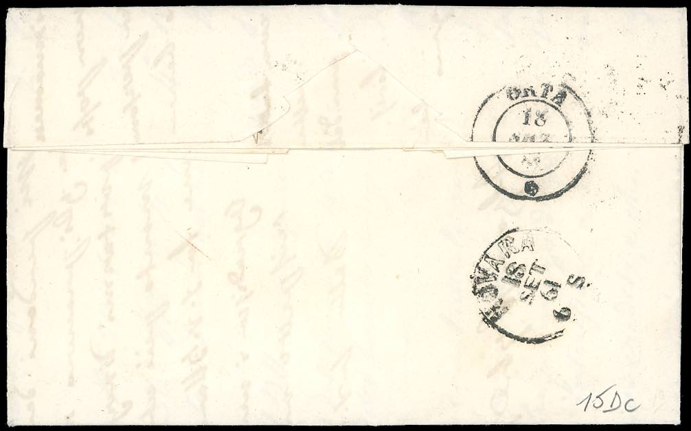 PIEMONTE-PELLA, d.c. ripetuto due volte sull'affrancatura, punti 13 - 20 cent. (15 Dc), perfetto e ben marginato, su lettera del 17/9/1861 ... Read more