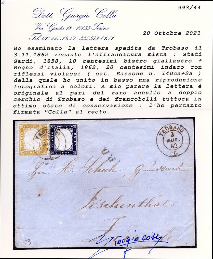 PIEMONTE-TROBASO, punti 13 - 10 cent. (14 Dca), in affrancatura mista con 20 cent. Regno d'Italia, non dentellato in basso (14Dca,2a), buono stato, su sovracoperta di lettera del 3/11/1862 per Zurigo, Svizzera. Insieme molto raro! A.Diena, cert. Colla.
