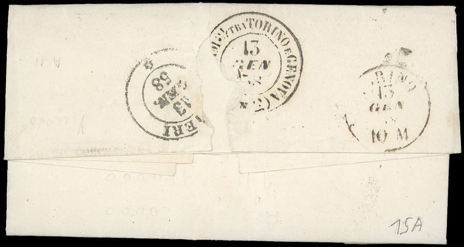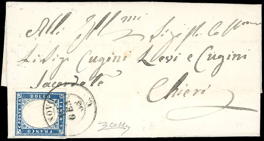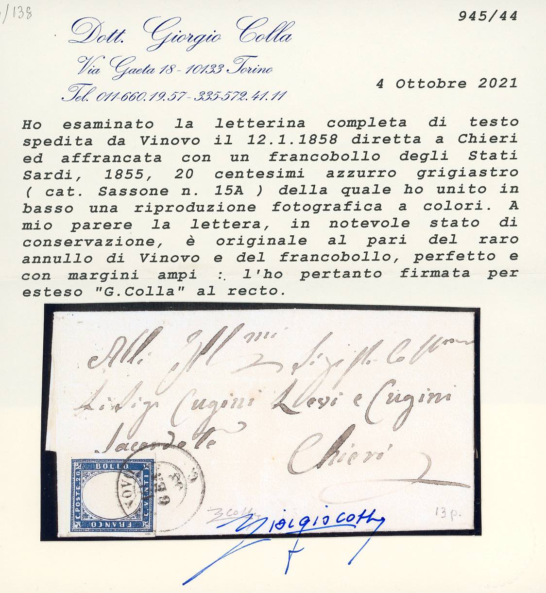 PIEMONTE-VINOVO, punti 13 - 20 cent. (15A), perfetto, su lettera del 12/1/1858 per Chieri. Rara e di ottima qualità. Cert. Colla.