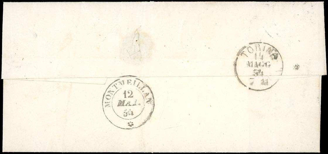 SAVOIA-LA ROCHETTE, punti 11 - 20 cent. (5), bordo di foglio in basso, giusto a destra, su sovracoperta di lettera del 12/5/1854 per ... Read more