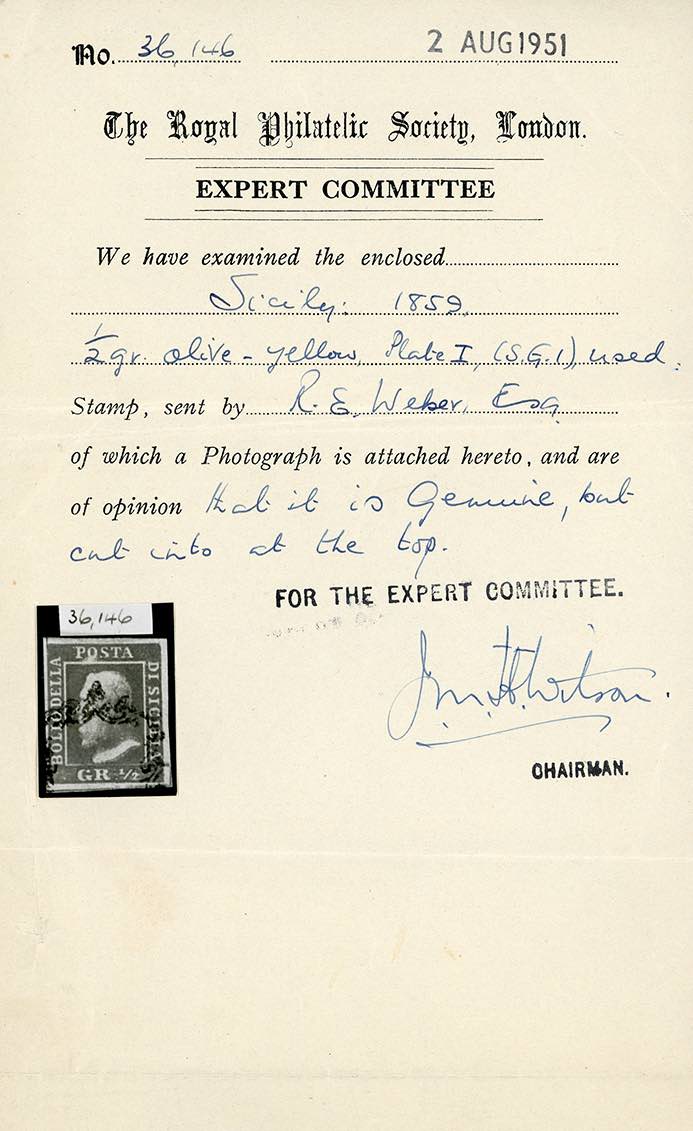 1859 - 1/2 grano giallo oliva, I tavola, carta di Napoli (1b), usato, lievi difetti. Tonalità di colore estremamente rara. Il colore più raro di tutta la Sicilia. D'ottimo aspetto. Cert. RPSL, Ferrario.
