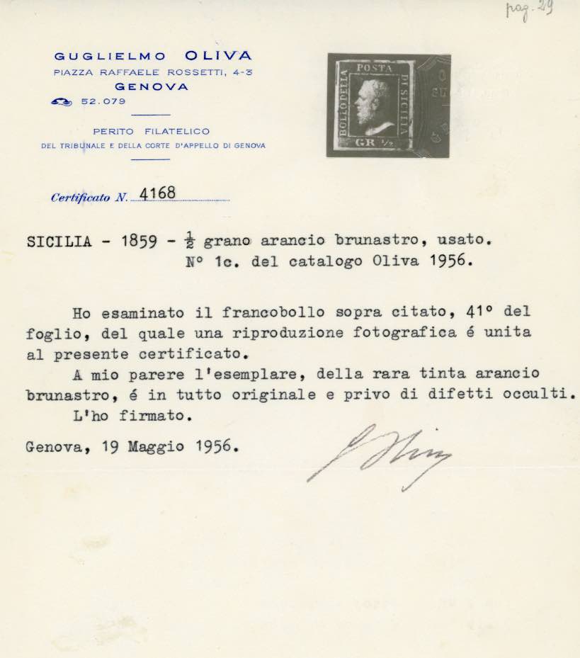 1859 - 1/2 grano giallo brunastro (1c), usato, perfetto. Rara tonalità, di ottima qualità. Em.Diena, Fiecchi, cert. G.Oliva, Ferrario.